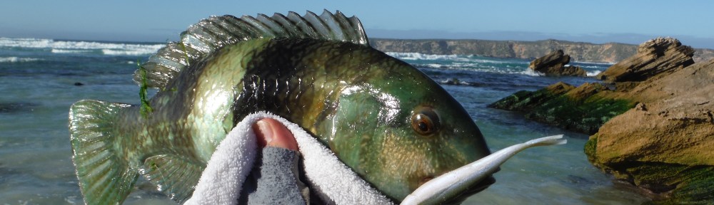 On Sunday it was cold and wet again, but at least the rain had kept the wind down. I drove out to Point Avoid in Coffin Bay National Park, again and started casting in the pre-dawn light. I had lost a few slugs and now only had a couple of Halco Raiders left. I tied on a 40 gram with some 20 lb fluorocarbon leader. I hooked up after a few casts – a small salmon about 30 cm long. They kept coming and the skies started to clear.