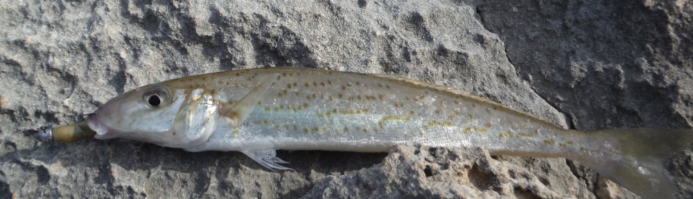In the afternoon I drove round to fish at Seal Rocks on the western side of the peninsula that surrounds Kellidie Bay. The rock ledge here faces west and the sunsets directly in front of it. The locals tell me they catch snapper, kingfish, whiting, gar, flathead, salmon and herring here. I started with a GULP Turtleback Worm in the Banana Prawn colour. I was using a 1/16th ounce 2 hook jighead and 8lb breaking strain fluorocarbon leader.