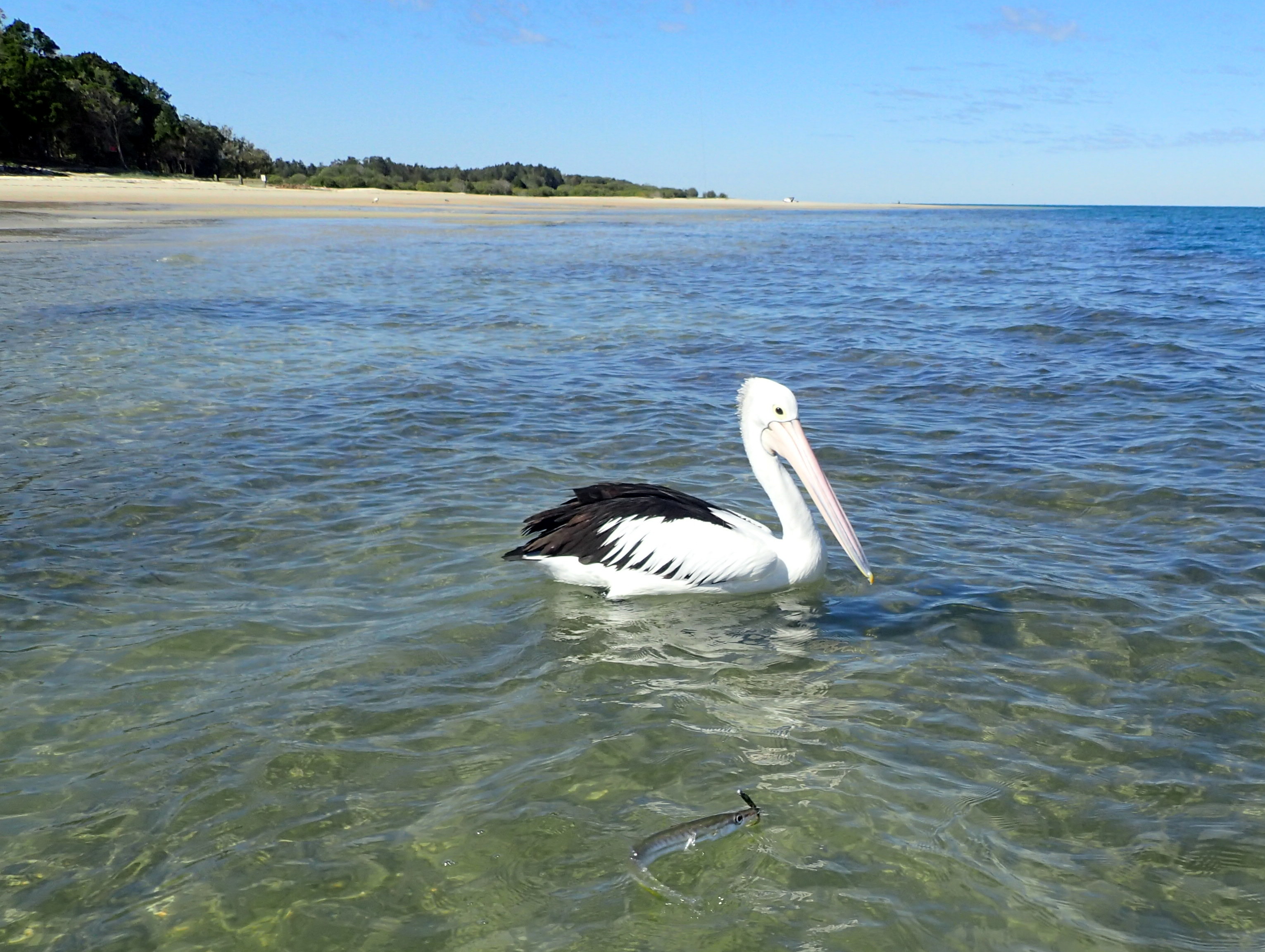 Pelican chases a hooked Pike