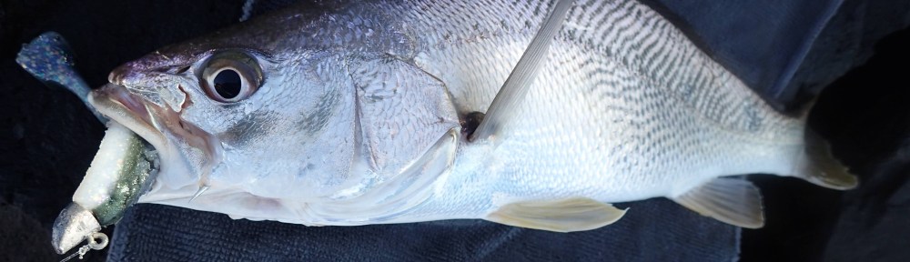 That was the start of a great mornings fishing. Over the next few hours high tide came and went but I kept catching small jewfish. The biggest was about 60 cm long and the smallest was just over 40 cm. I lost count but I caught somewhere between 10 and 15 fish. They were all too small to keep and so I released them all. Mixed in among them I caught a few solid bream and a couple of small tailor that destroyed my soft plastics. The profile, size and colour of the soft plastics did not seem to be much of a factor. I was using GULPS all day but I swapped between the Crazylegs Jerkshad, the Paddleshad, the Turtlebackworm and the straightforward Minnow – and they all caught fish. At one point I swapped to a Croaker hard bodied lure to see if this might attract a bigger one but this did not work.