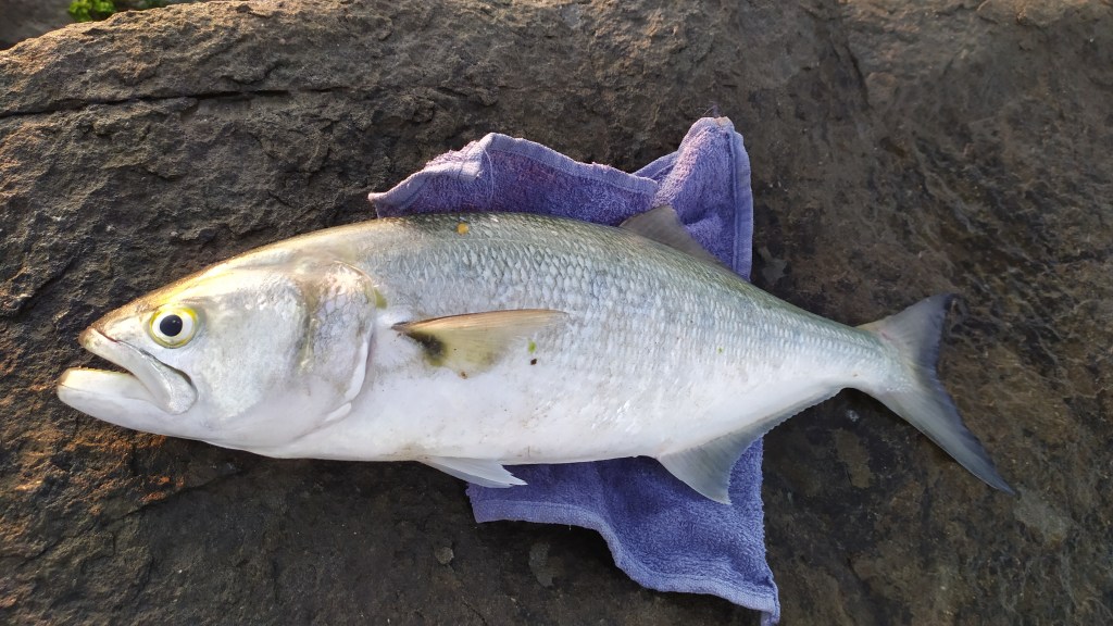 Out on the headlands, when the swell dropped off, I went in search of bigger fish. The tailor are pretty much a permanent fixture at dawn and dusk around the rocky points of Iluka. I was trying to catch jewfish/ mulloway and found a few in their usual hideouts. The tailor will attack anything they pass but I like using the various long thin slow sinking garfish impersonations and these are proving very successful for me.
