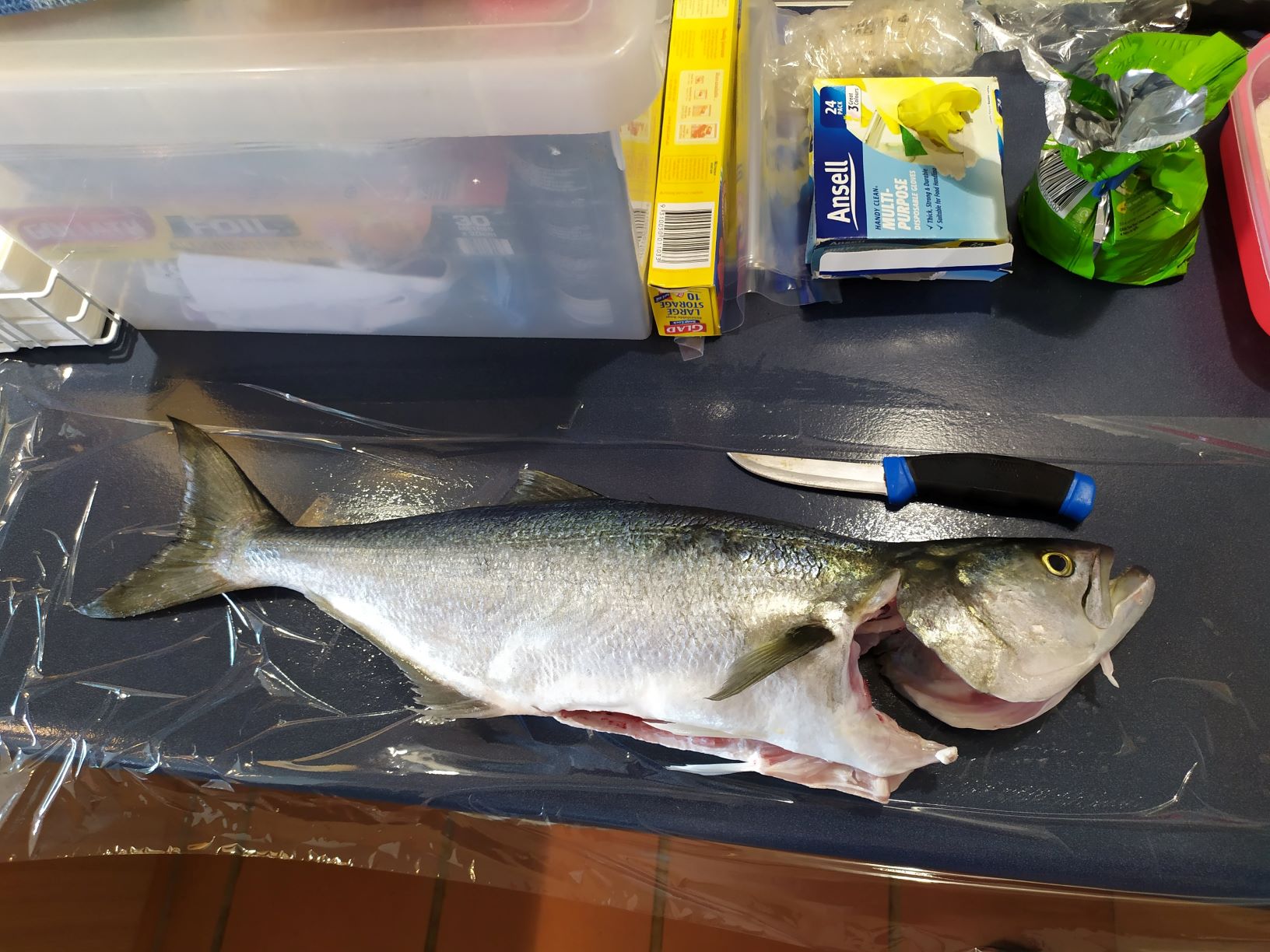 It was a solid mulloway/ jewfish about 85cm long and it weighed about 6.5 kg.  The jighead was still lodged in the corner of its mouth. This would make several dinners so I dispatched it and cleaned it up in the salt water.