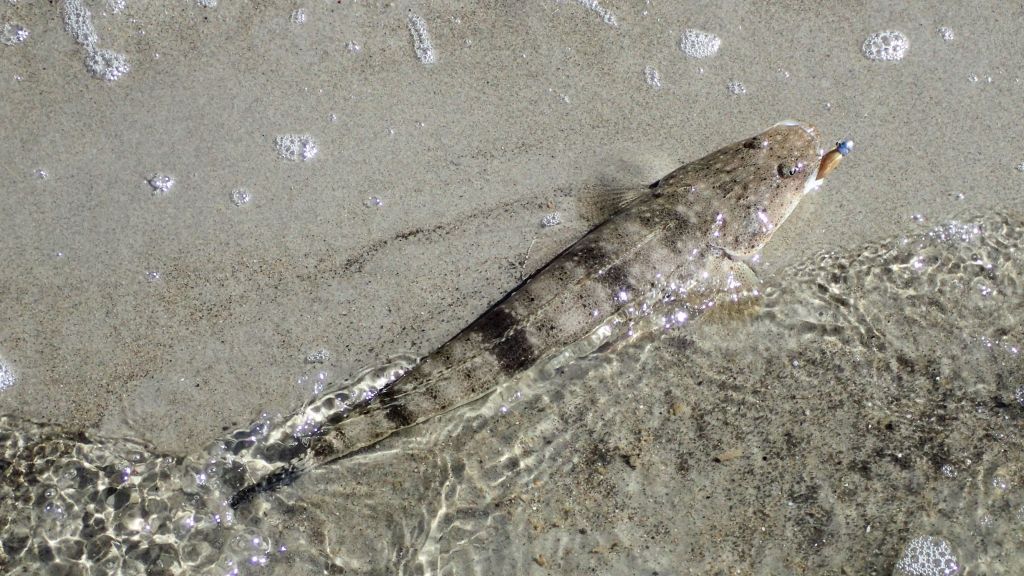 The tide had just started to run in strongly and despite the howling south-easterly the water was very clear. I started with a GULP 3″ Minnow soft plastic in the Lime Tiger colour. I loaded this onto a 1/8th ounce, size 1 jighead. I waded in the direction of the river mouth putting in long casts up into the incoming tide and then slowly hopping the lure back towards me along the bottom. I was staying about waist deep in the water. I caught a couple of very small (25cm) flathead that were moving up with the tide.
