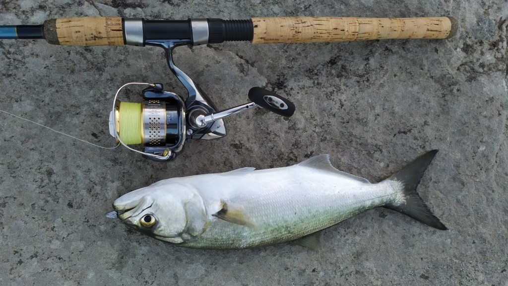 On the 5th of January low tide was at about 5:30 am. Sunrise was at 4:59 am. It was five days after the new moon. There was a light south westerly breeze and about a metre of swell. I did not have any luck fishing with a soft plastic through first light. So just before dawn I swapped to a hard bodied minnow. After a couple of casts I foul hooked a tailor.