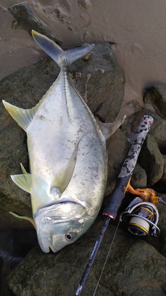 At about 6.15 am I swapped back to a big Gulp 7″ Crazylegs Jerkshad in the orange bellied shrimp colour that I loaded onto a 22 gram jighead. I was fishing with my Daiwa Saltist X MH962 rod and Saltist 10000 reel, 50 lb fluorocarbon leader and 40lb braid.